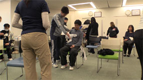 授業を覗いてみますと、講師の方レクチャーも指導もなくいきなり「右片マヒ」という前提で受講生さんに着替えをしてもらってます。